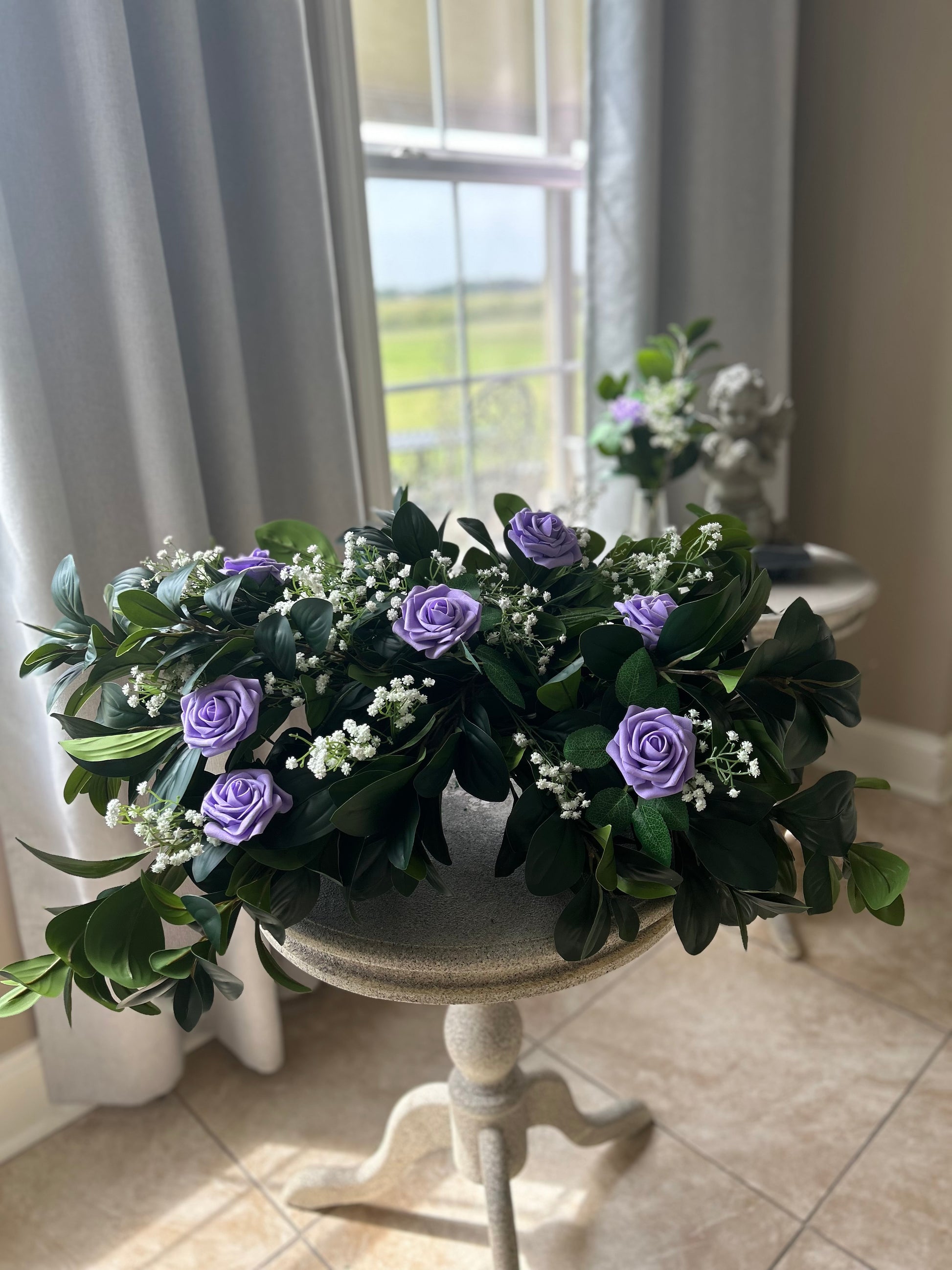 Customize the colors of your loved one’s floral headstone saddle with this arrangement designed with artificial roses and baby’s breath flowers. ~A part of Eden’s Memorial Collection