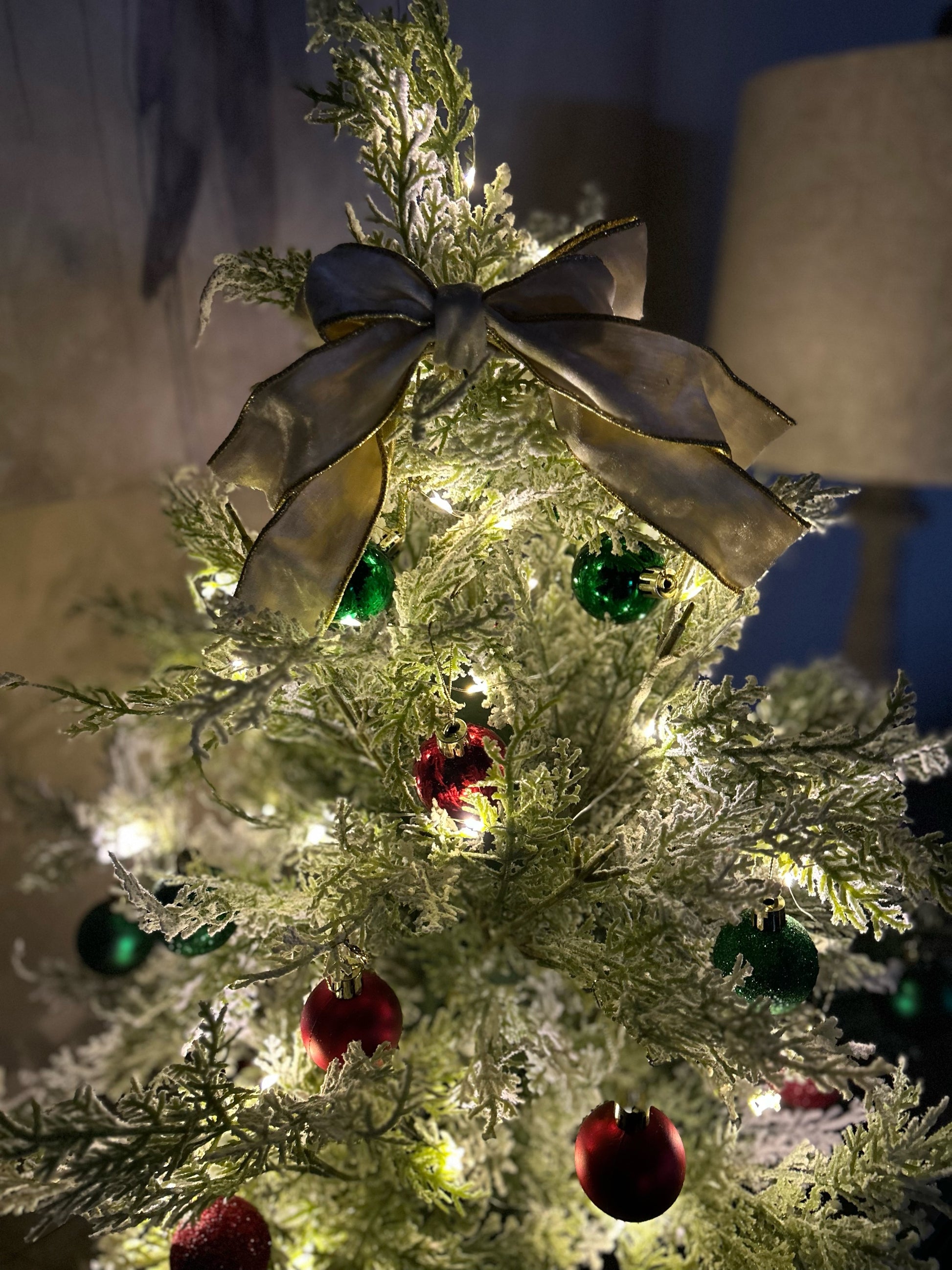 Add a touch of holiday elegance to your dining this season with this beautiful hand crafted table top Christmas tree which features artificial frosted pine stems, mini red and green ornaments, and a velvet ivory bow with gold trim. This tree comes with battery operated lights. Approx. Size 24”x18”x18” *~ A part of the Christmas Spirit Collection.