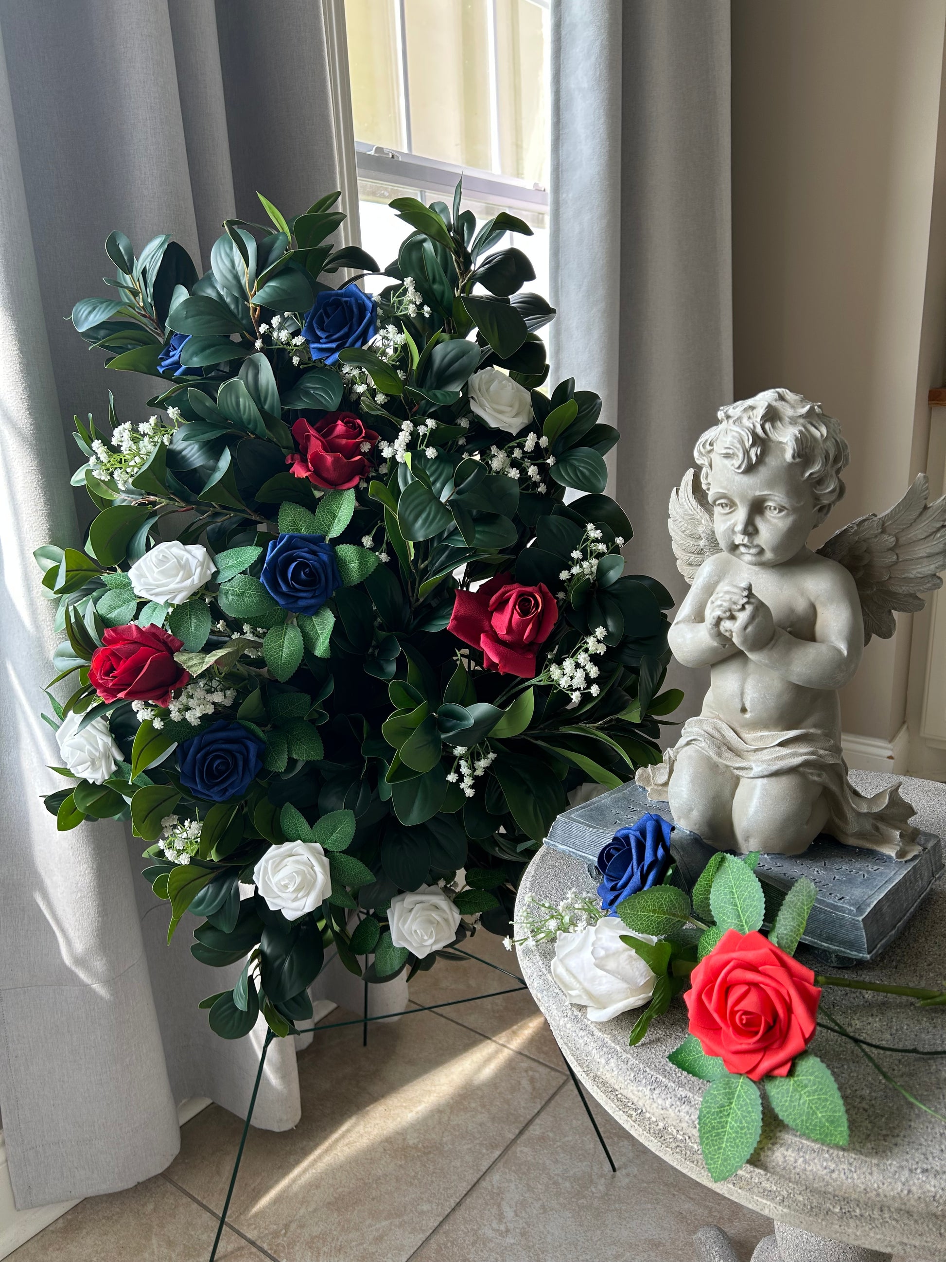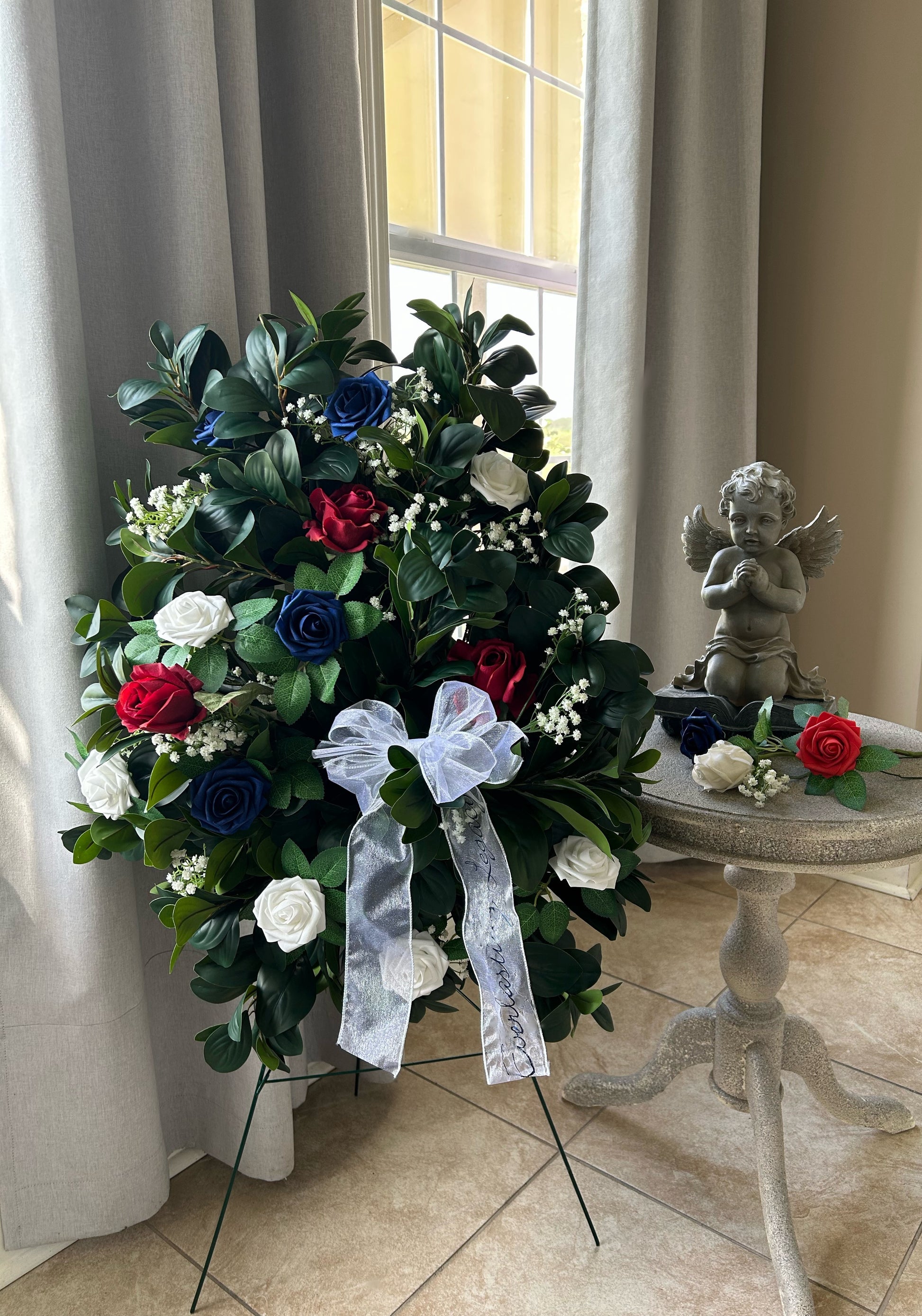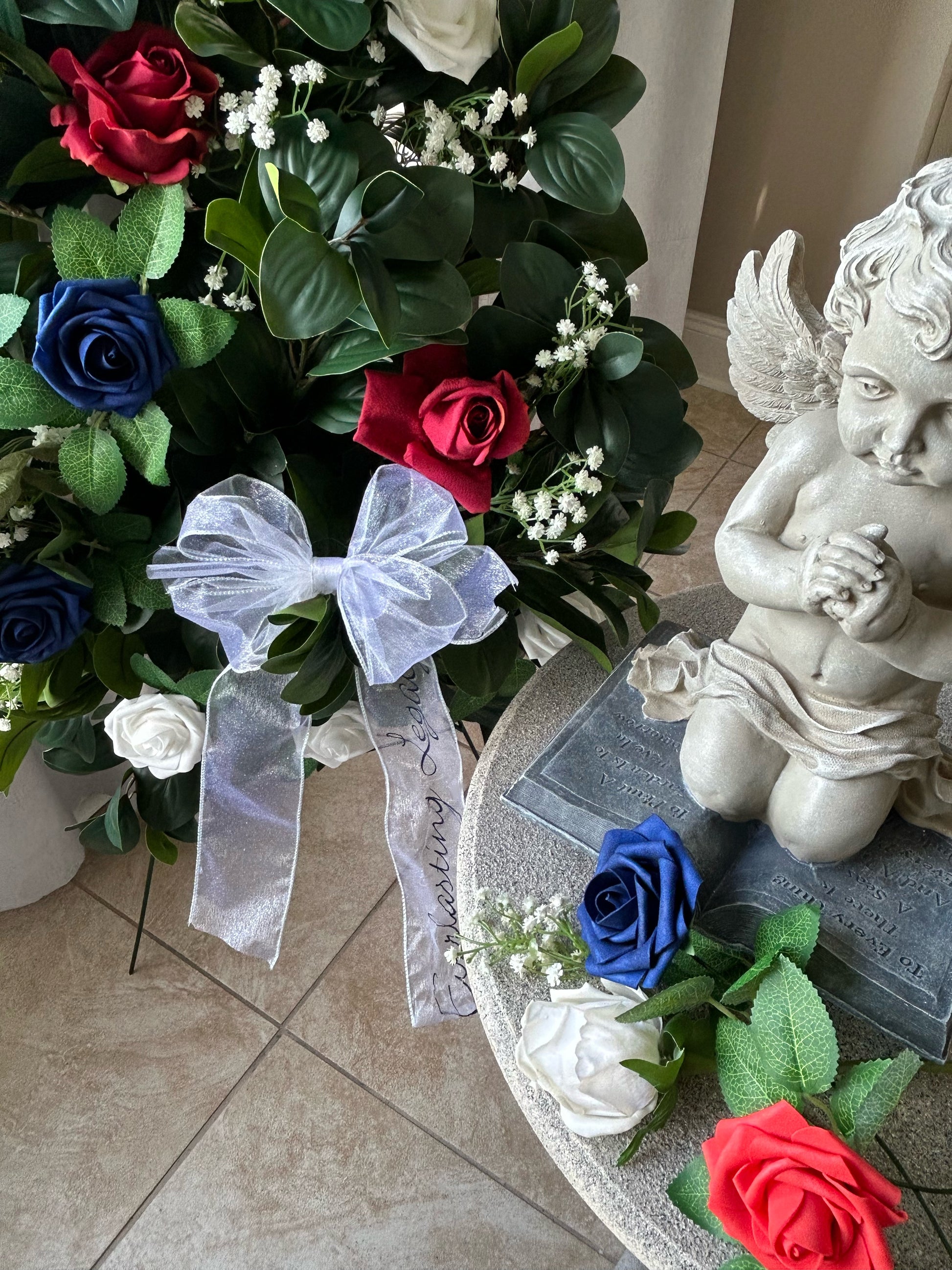 Honor your loved one’s patriotic spirit with this standing spray designed with artificial roses in patriotic hues and white baby’s breath flowers. This arrangement is available with an optional Signature “Everlasting Legacy” Script bow and comes with a 36” stand. ~ A part of Eden’s Memorial Collection