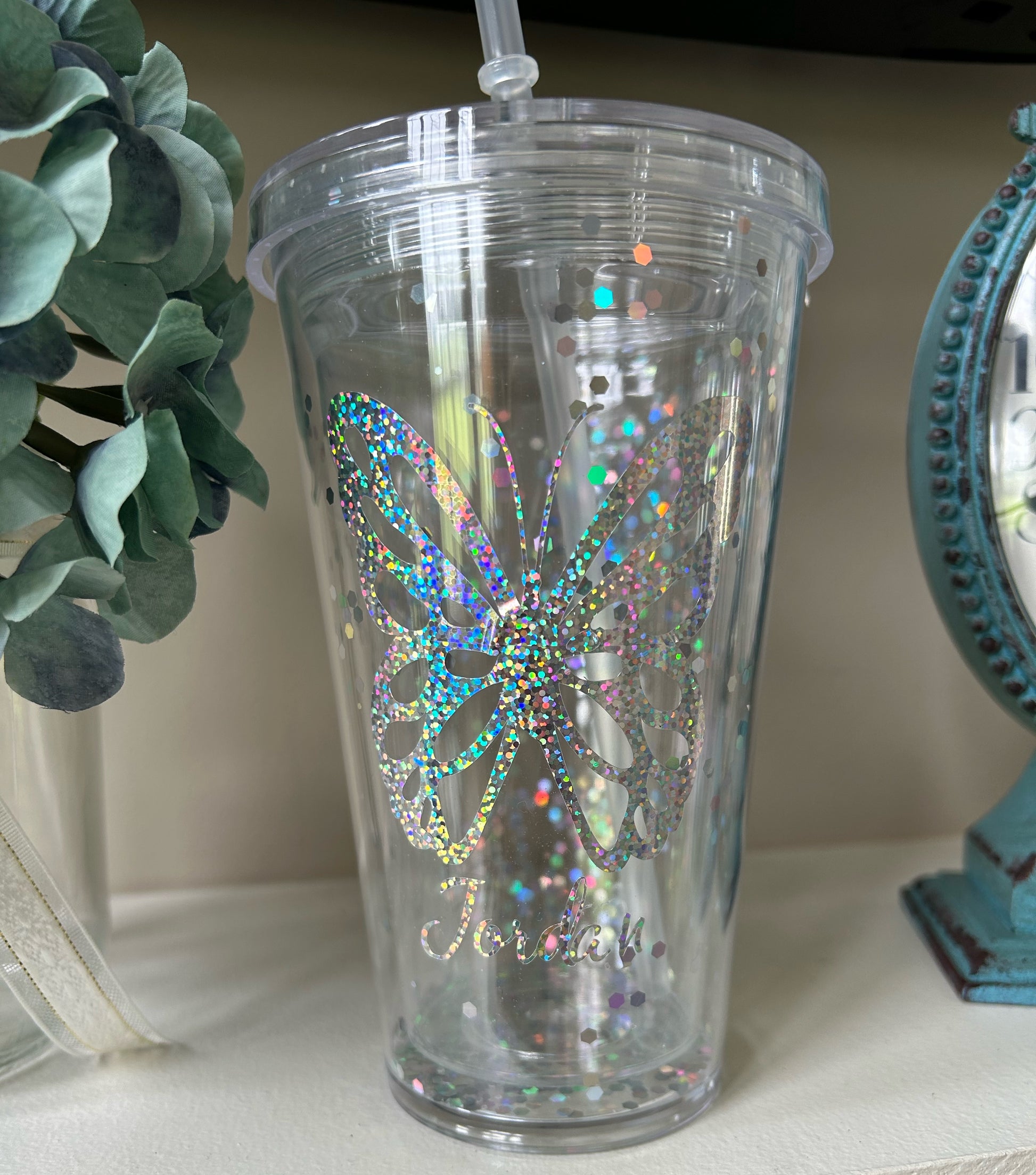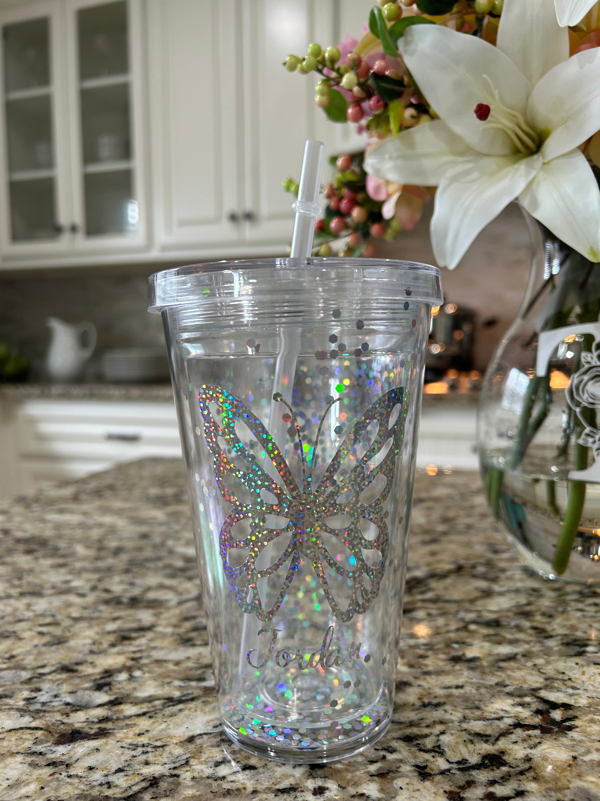 Add a personalized touch to your gift or your own tumbler collection with this 16 ounce insulated acrylic tumbler which features a vinyl butterfly and name. *Hand Wash Only- Not dishwasher safe.