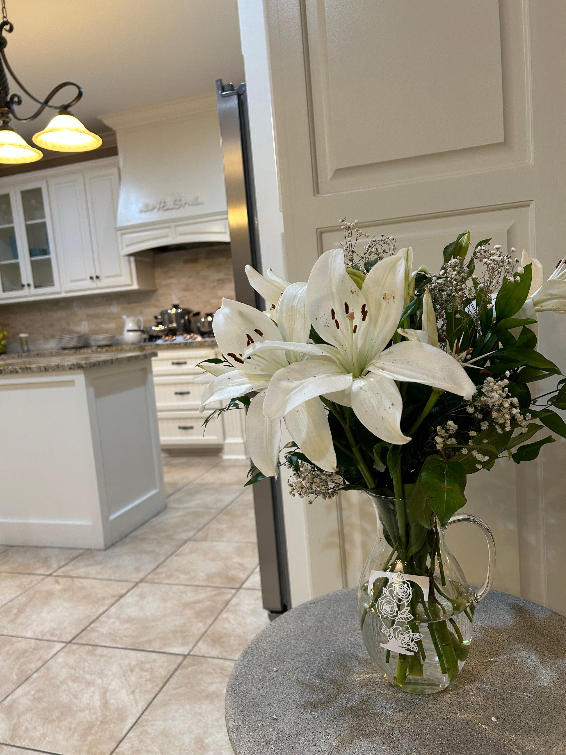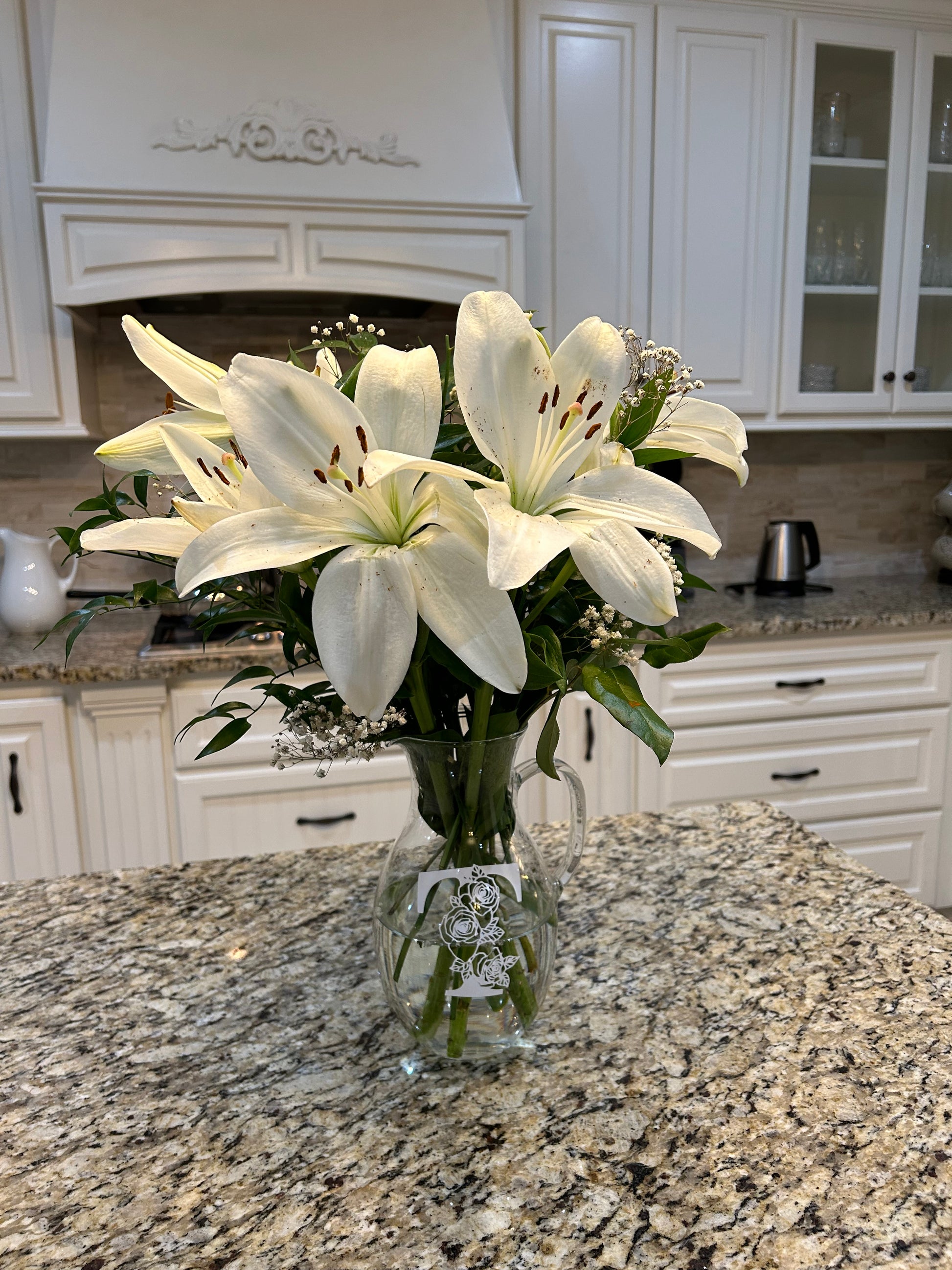 Make a bold statement with the timeless beauty that nature has to offer with this arrangement which features Casa Blanca oriental lilies and baby’s breath flowers in a vase personalized with a floral initial. ~A part of Eden’s Live Arrangement Collection