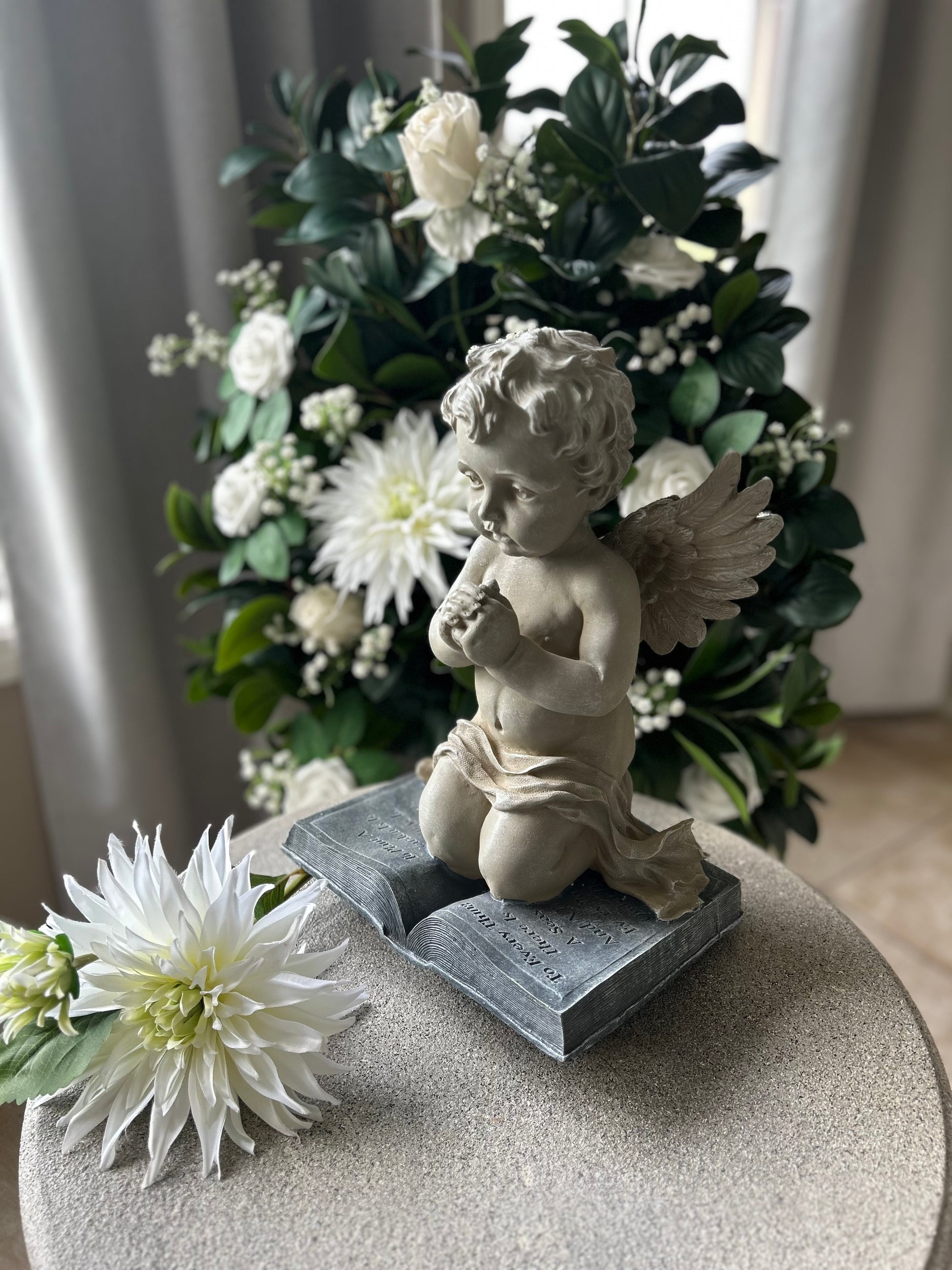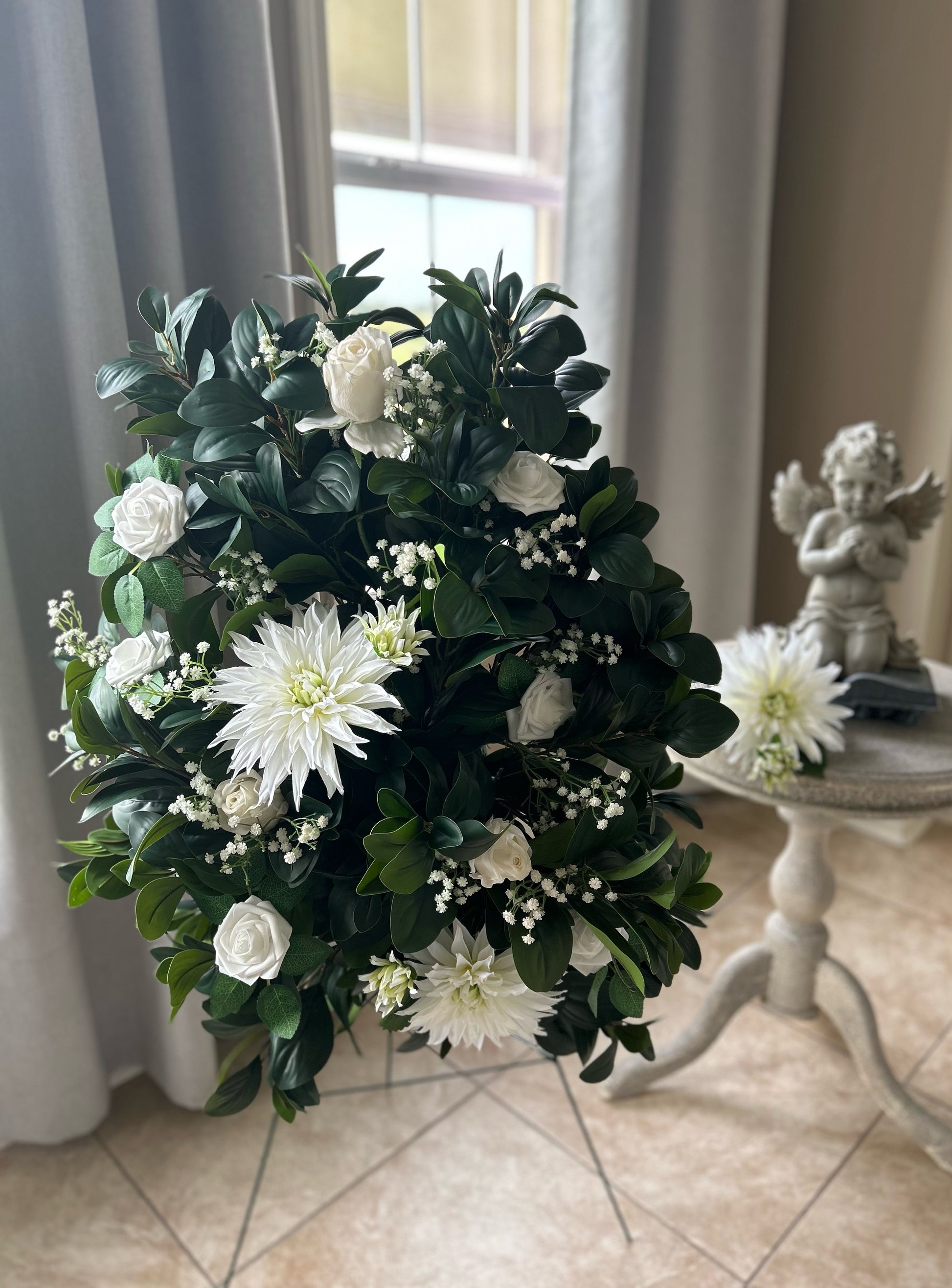 The Purity arrangement features white artificial flowers including dahlias, roses & baby’s breath. The stand is 36”. ~A part of the Memorial Collection