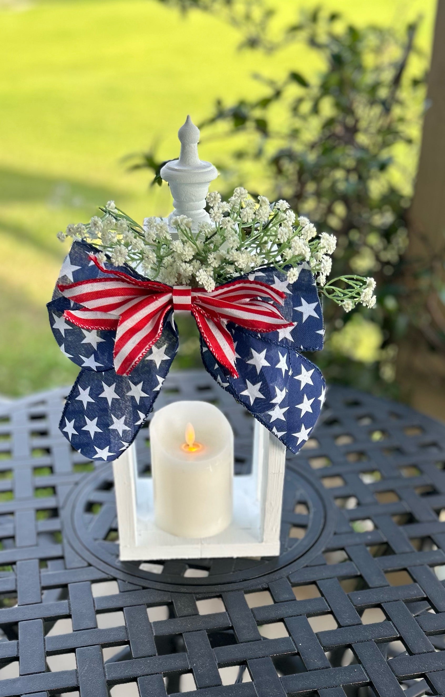 Illuminate your space this summer with the sweet patriotic beauty of this hand crafted lantern adorned with artificial baby’s breath flowers and a patriotic bow. *Use battery operated LED candles only. Candle not included.* Approx. Size: ~ A part of the Patriotic & Military Collection